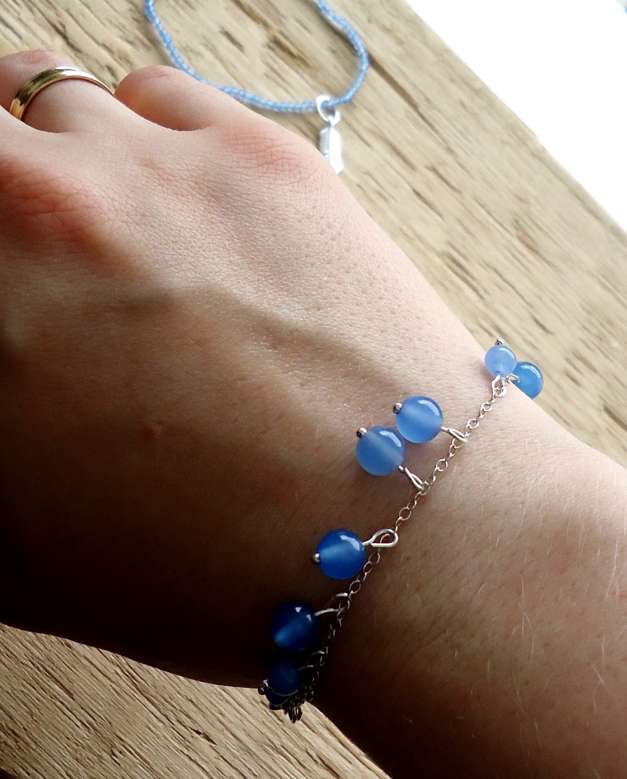 Jedno zamówienie na bransoletkę, zaowocowało małą serią biżuterii z agatem. Aneta zażyczyła sobie dokładnie taki odcień, dlatego wszechobecną we wszystkich sklepach miętę, zastąpiłam głębokim kolorem niebieskim. Zamówiłam kuleczki małe i duże, do tego trochę łańcuszka srebrnego, szpilki, a bigle i zapięcia odkopałam w moim małym warsztacie.